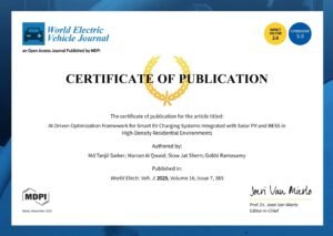 - Sarker, M. T., Al Qwaid, M., Shern, S. J., & Ramasamy, G. (2025). AI-Driven Optimization Framework for Smart EV Charging Systems Integrated with Solar PV and BESS in High-Density Residential Environments. World Electric Vehicle Journal, 16(7), 385. https://doi.org/10.3390/wevj16070385