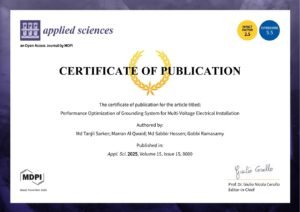 - Sarker, M. T., Al Qwaid, M., Hossen, M. S., & Ramasamy, G. (2025). Performance Optimization of Grounding System for Multi-Voltage Electrical Installation. Applied Sciences (2076-3417), 15(15). https://doi.org/10.3390/app15158600
