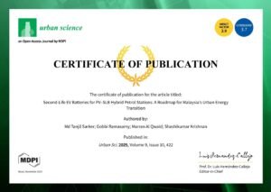 - Sarker, M. T., Ramasamy, G., Al Qwaid, M., & Krishnan, S. (2025). Second-Life EV Batteries for PV–SLB Hybrid Petrol Stations: A Roadmap for Malaysia’s Urban Energy Transition. Urban Science, 9(10), 422. https://doi.org/10.3390/urbansci9100422